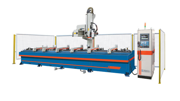 适用于各种铝型材的安装孔、流水槽、锁孔、形孔的加工工序,并带有锯片,可对型材进行角度锯切加工。